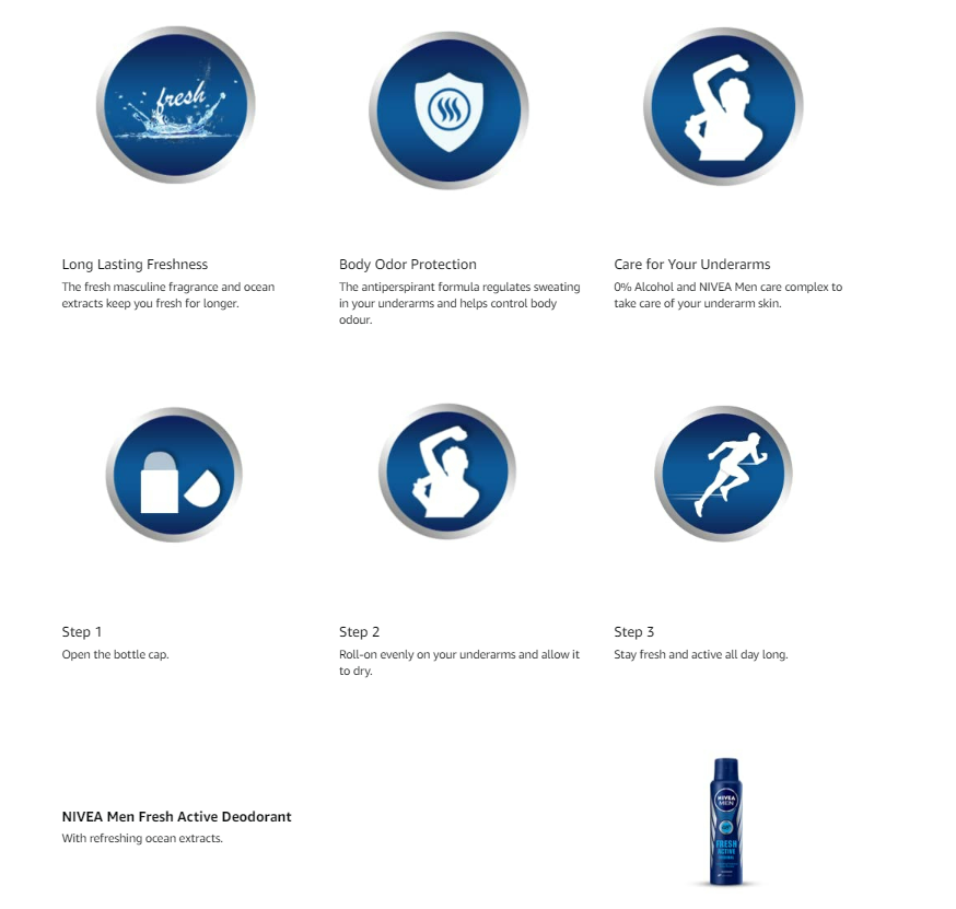 Beat the heat with the NIVEA Men Fresh Active Roll On. With refreshing tones of ocean extracts, stay fresh, stay active this summer. The masculine fragrance keeps you fresh and confident all day while the care complex takes care of your underarm skin.